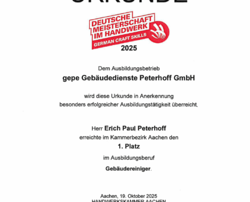 Unser Dienstleistungsportfolio richten wir konsequent am Bedarf unserer Kunden aus und entwickeln das Leistungsspektrum kontinuierlich weiter. Die gepe PETERHOFF Gruppe ist bundesweit vertreten, wir betreuen von unserer Zentrale in Düren und den regionalen Niederlassungen in Berlin, Hamburg, Herne, Kaarst, Köln/Bonn, Magdeburg, München, Rheda-Wiedenbrück, Suhl und Wiesbaden mehr als 1900 Objekte in der Gebäudereinigung und im Gebäudemanagement. Von unseren Servicepunkten in Aachen, Bonn, Bremen, Erlangen, Euskirchen, Flensburg, Köln, Mainz, Passau, Stolberg, Ulm, Wismar und Wuppertal stärken wir die regionale Nähe zu Kunden und Mitarbeitern zusätzlich.